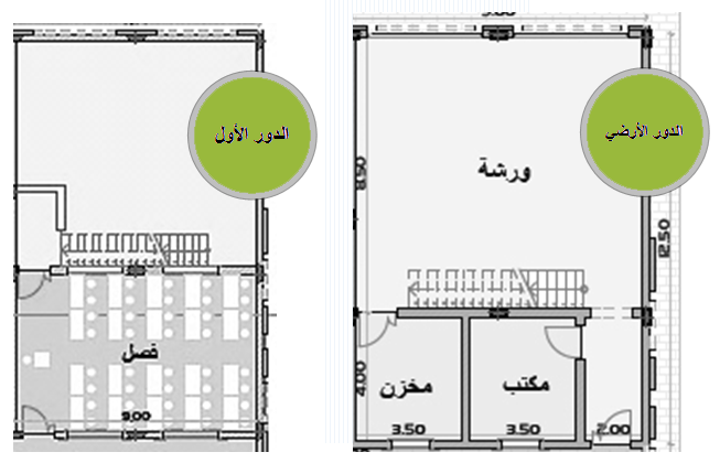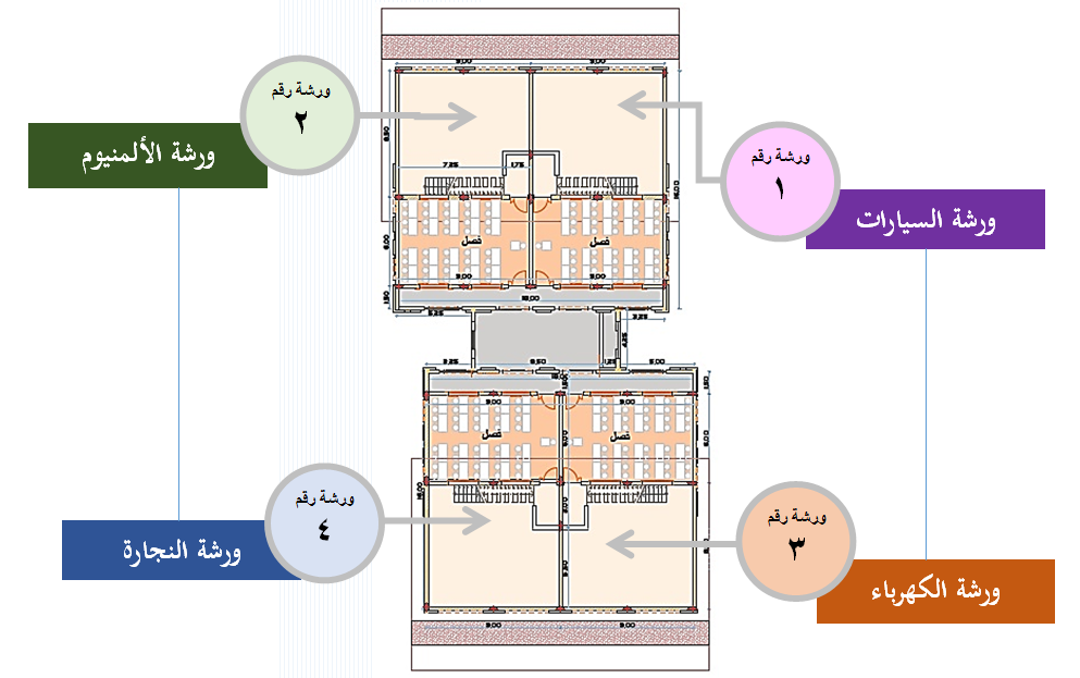 المشروع عبارة عن 4 ورش للتدريب الحرفي (ورشة السيارات - ورشة الالمنيوم - ورشة النجارة - ورشة الكهرباء) وملحقاتها وهي: